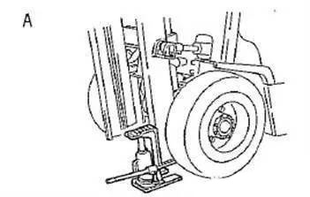 4. 把叉車頂起到輪胎依然稍 稍與地面接觸的程度,車架下面放置墊塊,以防止下落。 當更換前輪胎時,在前部放 置墊塊。當更換后輪胎時, 在后部放置墊塊。