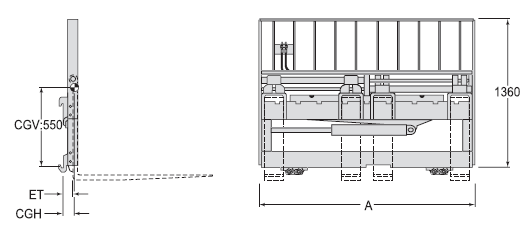 | Capacity 承載能力(kg) | Catalog Order NO 型號 | Mounting Class 安裝等級 | Opening Range貨叉調距范圍ITO(mm) | Minimum Truck Carriage Width叉車貨叉架寬度最小值(mm) | Overall Width總寬A(mm) | Fock Pocket Width適配貨叉寬度(mm) | Weight 自重(kg) | Effective 失載距ET(mm) | Horizontal Center of Gravity 水平重心CGH(mm) |