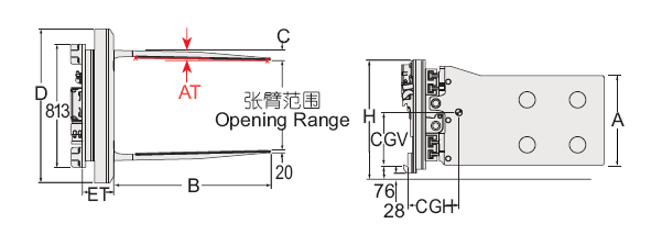 | Capacity 承載能力(kg) | Catalog Order NO 型號 | Mounting Class 安裝等級 | Opening Range張臂范圍(mm) | Arm Height臂高A(mm) | Arm Length臂長B(mm) | Arm Thickness臂厚C(mm) | Overall Height總高H(mm) | Frame Width 框架寬度D(mm) | Arm Toe in內(nèi)扣量AT(見注5)(mm) | Weight 自重(kg) | Effective 失載距ET(mm) | Horizontal Center of Gravity 水平重心CGH(mm) |