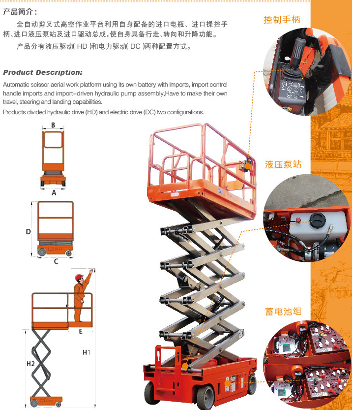 全自動剪叉式高空作業平臺利用自身配備的進口電瓶、進口操控手柄、進口液壓泵站及進口驅動總成,使自身具備行走、轉向和升降功能。
